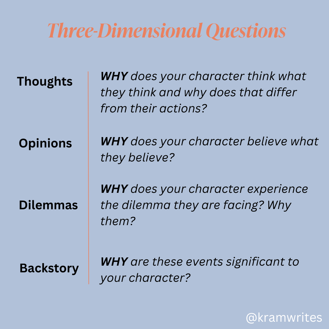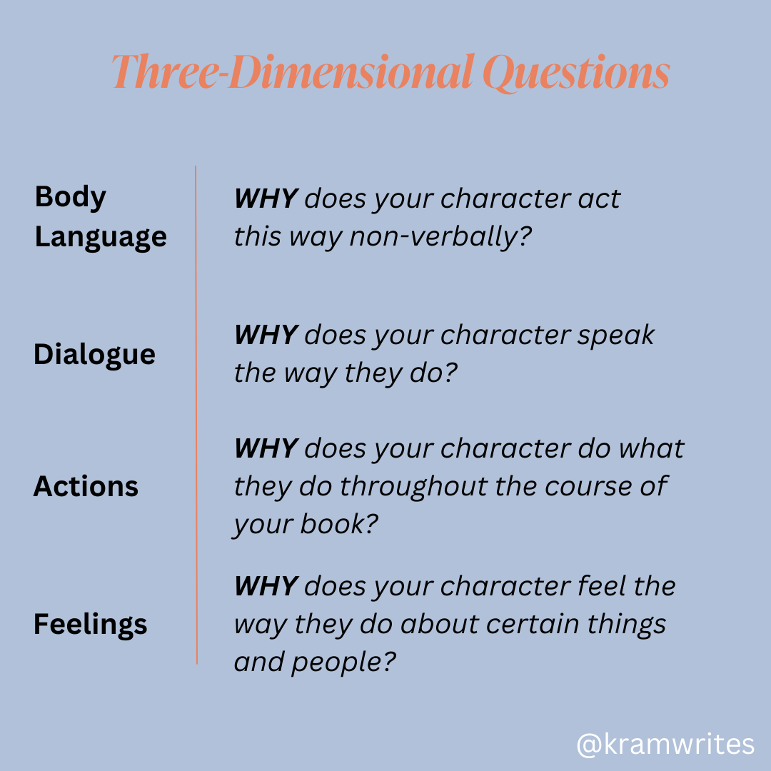 How and what questions combined with why questions give us a full, three-dimensional understanding of a character. We are able to see their unique characteristics, along with motivations and insight. When the reader feels like they fully understand the character, they feel more fully invested in your story and can now focus on the awesome details and plot. So, always ask yourself why before the reader has a chance to.
